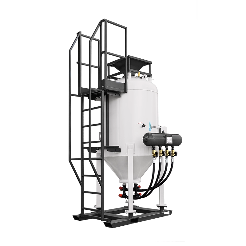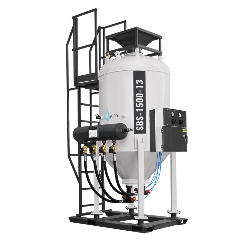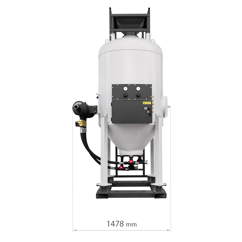 Die Wasserstrahlanlagen der SBM-H-Serie ermöglichen eine Oberflächengüte bis zur Klasse SA-3/SP5 und eine Kapazität von bis zu 324 m2/h in einer staubfreien Atmosphäre. Die Hydrosandstrahlanlagen/Soda-Strahlanlagen der SBM-H-Serie sind mit einem pneumatischen Wasserstrahlformungssystem ausgestattet, das mit Druckluft und dem einzigartigen WIN-BA-Hydrodüsenstrahl arbeitet (der etwa 30% weniger Luft verbraucht als herkömmliche Düsen). Große Klauenanschlüsse, die eine schnelle und sichere Verbindung garantieren und gleichzeitig einen hohen Durchfluss des Druckluftstroms aufrechterhalten. Die Strahlmittelbeladung erfolgt durch eine pneumatisch betriebene Gummimembran - ohne die Notwendigkeit ineffizienter Schraubverbindungen - was die Sandstrahler der SBM-Serie sicherer und einfacher zu bedienen macht. Die Hydrosandstrahlanlage/Soda-Strahlanlage ist außerdem mit einem großen Inspektionsventil für eine schnelle Entleerung des Behälters und die Möglichkeit einer internen Inspektion ausgestattet.