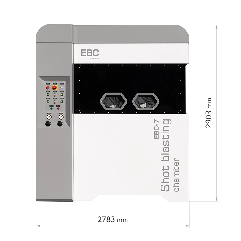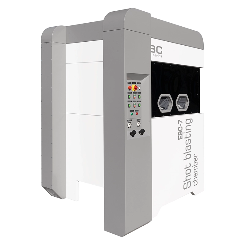 Strahlanlagen der Serie EBC arbeiten in einem geschlossenen System und gewährleisten die Entfernung von Verunreinigungen, die Reinigung und Rückgewinnung des Strahlmittels sowie dessen erneute Rückführung in den Kreislauf. Die Strahlbearbeitung in den Strahlkabinen der Serie EBC kann manuell erfolgen (der Bediener befindet sich außerhalb der Bearbeitungszone und führt den Strahl manuell über eine in einer speziellen Halterung montierte Düse), halbautomatisch oder automatisch (wobei die Bewegung der Werkstücke und der Düse durch pneumatische bzw. elektrische Antriebe gesteuert wird). EBC-Strahlkabinen können optional mit Antrieben für Be- und Entladung, Drehung sowie Transport der Werkstücke ausgestattet werden.